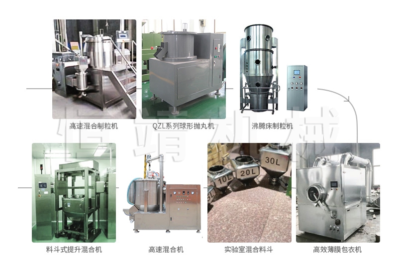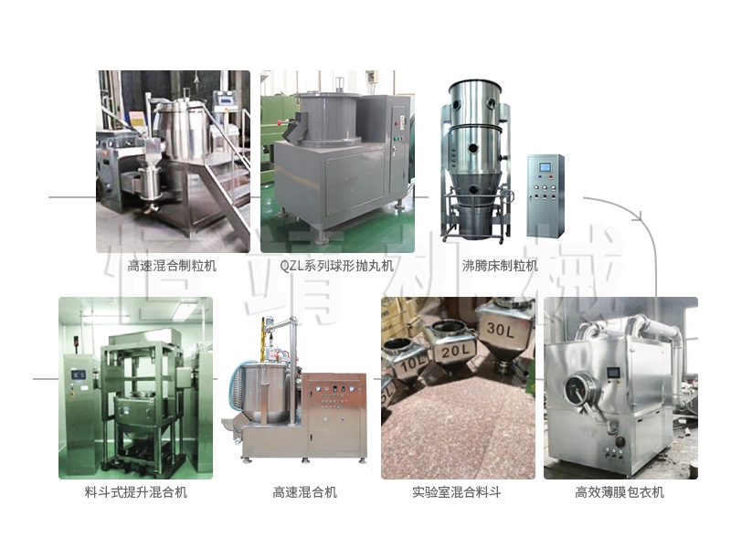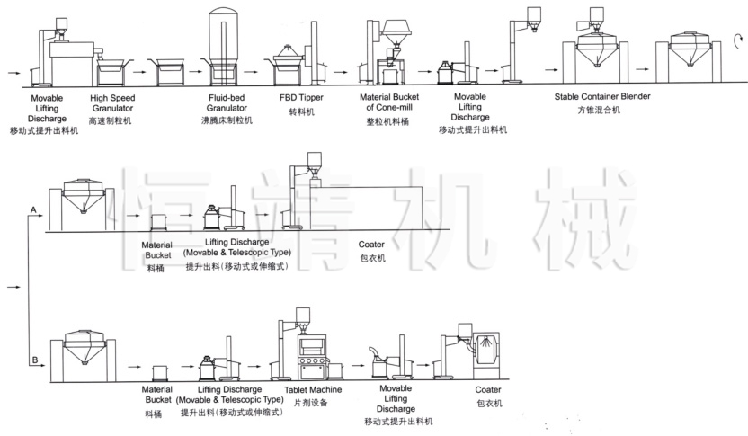 将配备好物料的周转料斗推至与湿法制粒机机旁→向湿法制粒机中真空加料→经过制粒→湿整粒→干燥→物料提升(干物料)整粒→干整完后的颗粒落入周转料桶→接料结束将周转料桶推至总混合机提升加料至总混料筒→总混后的物料分料落入周转料斗→将周转料斗通过提升向压片机(或胶囊充填机)加料→使用后的料斗推到清洗中心清洗。