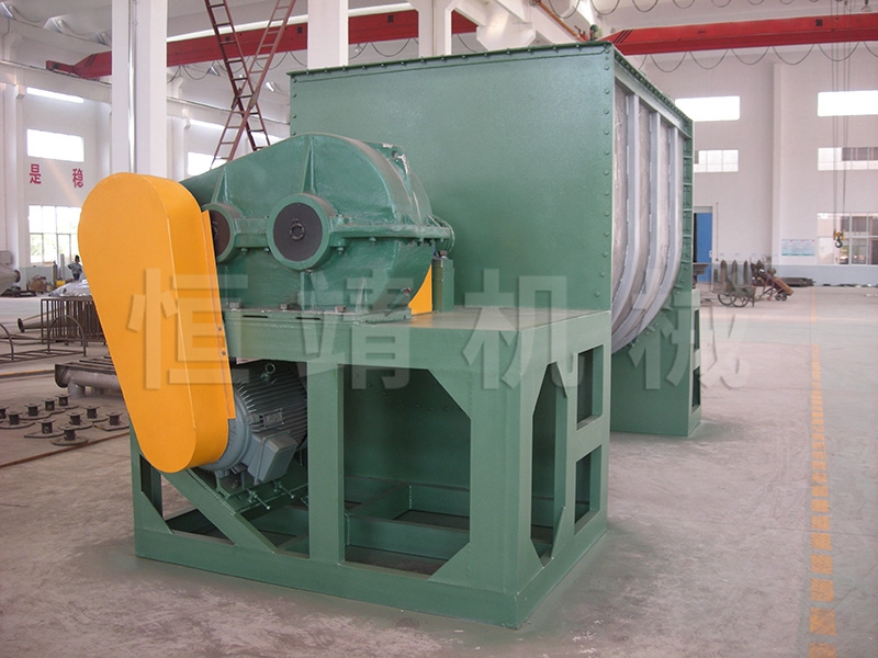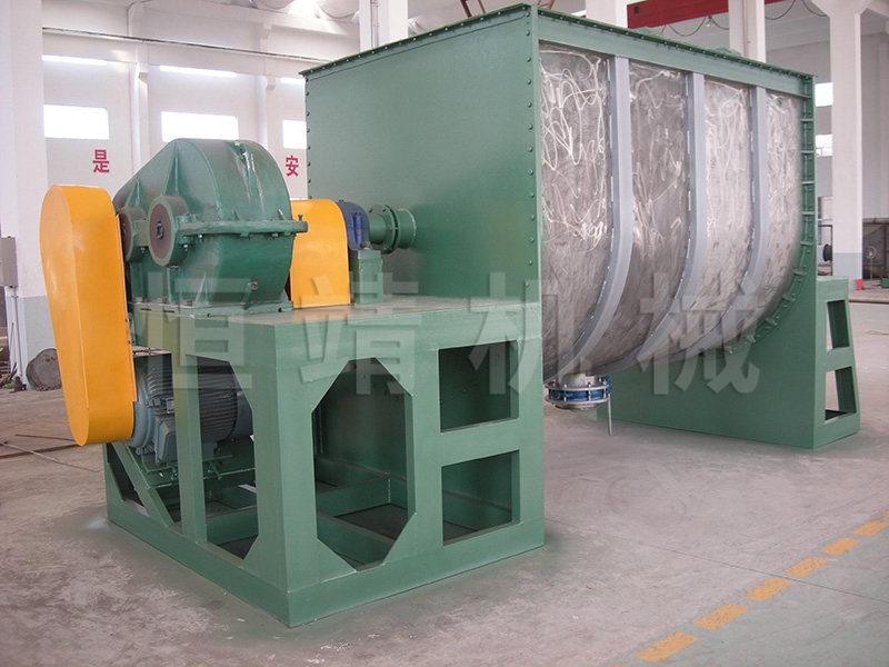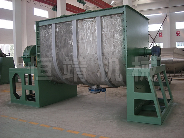 卧式螺带混合机由安装于搅拌轴上的内外径螺旋带动桶体内物料翻动,使搅拌器在桶体内大范围翻动物料。搅拌器结构上,螺旋设计成内外、左右互为反螺旋,搅拌器工作时内螺旋带动靠近轴心处物料做轴心旋转,轴向由内至两侧推动,外螺旋带动靠近筒壁物料做轴心旋转,轴向由两侧至内推动,于是造成物料在筒体内对流循环、剪切渗混,完成物料在较短时间内快速均匀混合。