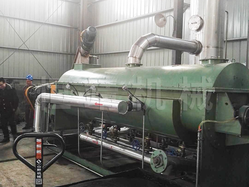 浆叶干燥机已成功地用于食品、化工、石化、染料、工业污泥等领域。设备传热、冷却、搅拌的特性使之可以完成以下单元操作:燃烧(低温)、冷却、干燥(溶剂回收)加热(融化)、反应和灭菌。搅拌浆叶同时又是传热面,使单位有效容积内传热面积增大,缩短了处理时间。楔型浆叶传热面又具有自清洁功能。压缩--膨胀搅拌功能使物料混和均匀。物料沿轴向成"活塞流"运动,在轴向区间内,物料的温度、湿度、混合度梯度很小。用导热油做热介质浆叶干燥机可完成低温燃烧工作。如:二水硫酸钙(Ca2SO4·2H2O) 燃烧转化为半水硫酸钙(Ca2SO4·1/22H2O)。碳酸氢钠(NaHCO3)经煅烧转化为纯碱(Na2HCO3)等。通入冷却介质,如水、冷却盐水等即可用来冷却。如:使用于纯碱行业的浆叶式凉碱机,取代老式的空气冷却凉碱机,节省了能源及尾气处理设备,降低了操作费用。干燥,设备主要的功能,不使用热空气,使溶剂回收、能源消耗、环境控制处于易处理的状态。对需回收溶剂、易燃易氧化热敏性物料尤为适应。已广泛用于精细化工、石化、染料行业。轴向区间内,温度、湿度、混合度的均匀性,使得设备可用来加热或融化,或进行一些固体物料反应。在复合肥及变性淀粉行业均已成功使用。浆叶干燥机可用来对食物和面粉进行灭菌处理。单位有效容积内大的加热面积,很快就将物料加热到灭菌温度,避免了长时间加热而改变物料品质。