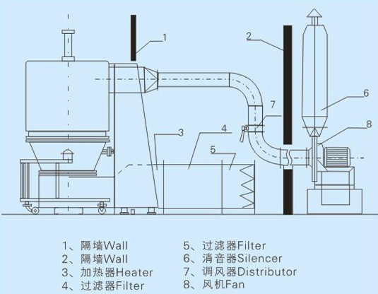 空气经加热净化后,由引风机从下部导入,穿过料斗的孔洞板。在工作室内,经搅拌和负压作用形成流态化,水份快速蒸发后随着排气带走,物料快速干燥。